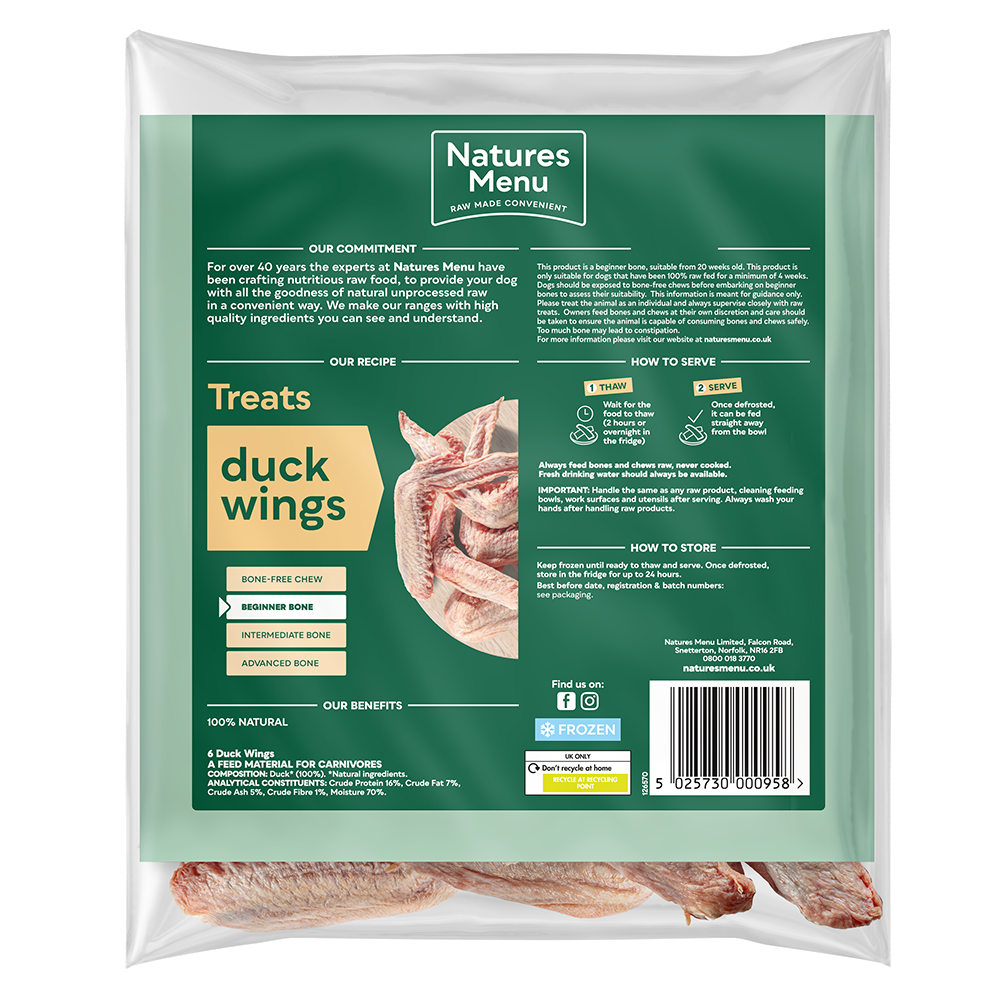 Dogs can find the action of chewing calming and comforting, so pick these duck wings for dogs as a delicious raw treat. Serve no more than 1-3 times a week.