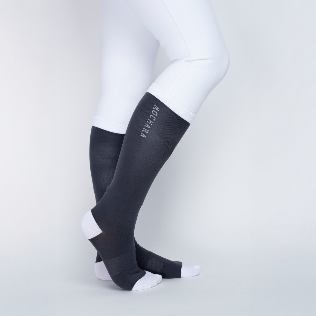 The Mochara knee-high long horse riding socks have been developed for performance. Designed with a super soft stretch sock with reinforced heel and arch compression for ultimate comfort and a lightweight leg material to reduce bulk under your riding boots. These socks are perfect for equestrian competition or everyday horse riding.