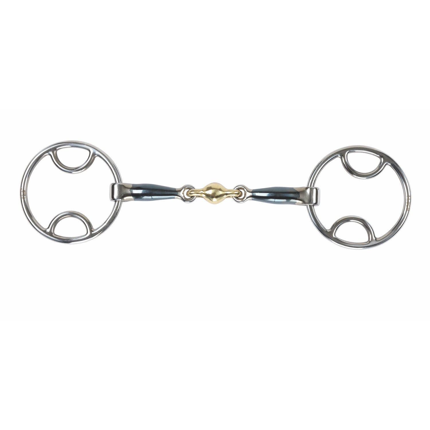 The bevel bit allows mild leverage and offers a little more control, promoting outline, head carriage and responsiveness. The loose brass alloy discs in the centre can help to soothe a fussy tongued horse. Mouthpiece thickness: 15mm. Cheek height: 55mm (4.5", 5"), 70mm (5.5"). Blue sweet iron mouthpieces oxidise easily to create warmth with a sweet taste which helps with bit acceptance and encourages salivation. Please note the blue colour will fade with use. Stainless steel is used for the cheeks due to it being durable, easy to clean and resistance to rust.