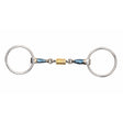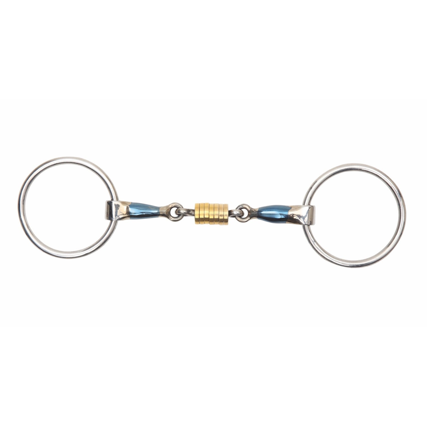 The loose ring cheek has greater movement than a fixed cheek which can discourage fixing and leaning. The loose brass alloy discs in the centre of the bit can help to soothe a fussy tongued horse. Mouthpiece thickness: 15mm. Cheek height: 65mm. Blue sweet iron mouthpieces oxidise easily to create warmth with a sweet taste which helps with bit acceptance and encourages salivation. Please note the blue colour will fade with use. The addition of brass alloy inserts produces a warm, more palatable bit. Stainless steel is used for the cheeks due to it being durable, easy to clean and resistance to rust.