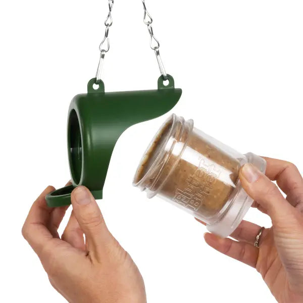 Complete with a metal hanging chain, the feeder can be hung from a branch, hook or feeding station.