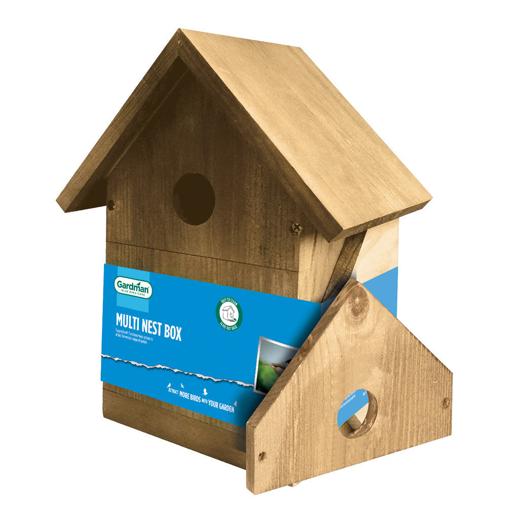 The Gardman Multi Nest Box is ideal for birds to nest in, especially during the winter months. This box will encourage many different birds into your garden with its interchangeable entrances. Robins will use the open front option, whereas smaller birds like blue tits and also tree sparrows will enter through the 28mm hole option. Additionally, the 32mm hole will encourage larger species such as house sparrows.