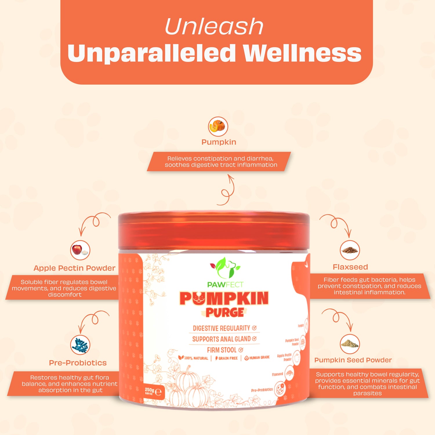 Packed with pumpkin, carrot, and flaxseed, this gut-friendly topper supports smooth digestion, stool regularity, and microbiome balance. Enriched with probiotics, prebiotics, and digestive enzymes, it’s the all-natural solution for optimal canine gut health.