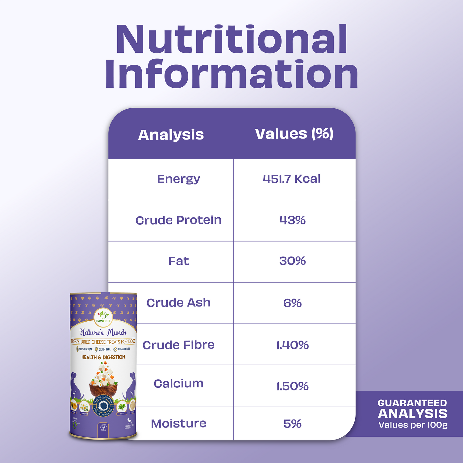 Specially formulated to support digestive wellness, these freeze-dried treats combine the goodness of cottage cheese with papaya, chamomile, parsley, and psyllium. Each ingredient is carefully selected for its role in promoting smoother digestion, reducing bloating, and maintaining a healthy gut. Naturally low in carbs and rich in fiber, these treats are perfect for dogs with sensitive stomachs or those on weight management plans. Light, crunchy, and packed with nutrients, they’re a functional snack your dog will love.