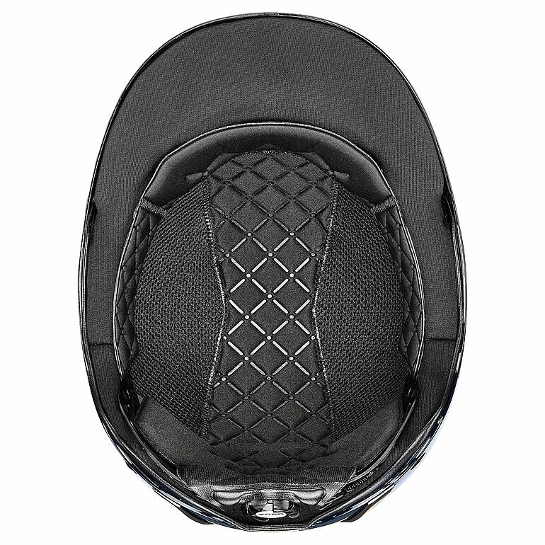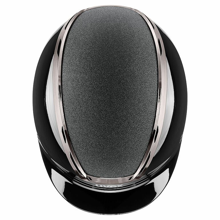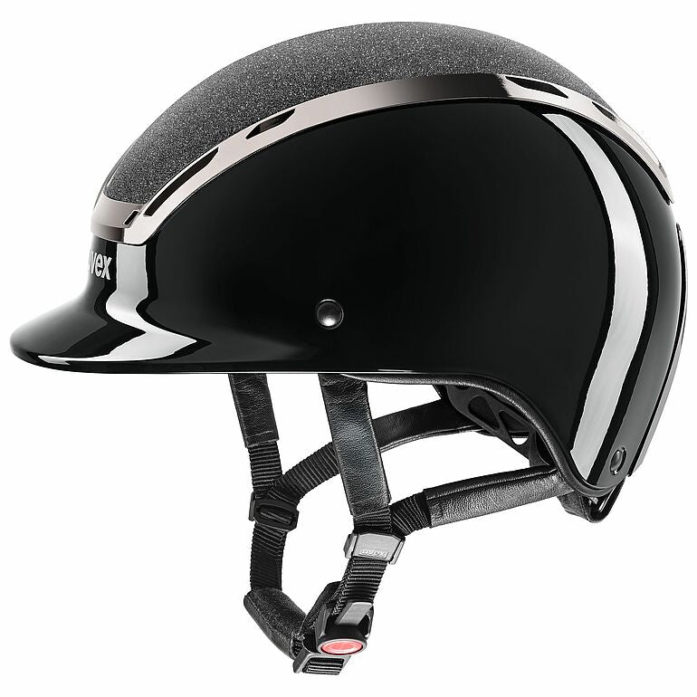 High-performance. Stylish. Comfortable. High-tech safety meets functional elegance in the uvex exxeed blaze. With a high-gloss piano lacquer finish, glamour top and chrome frame, for a glowing performance in the ring. Comfortable and protective for a safer ride. The hardshell construction of this riding helmet, made up of a sturdy plastic outer shell and lightweight EPS core, is extremely impact resistant. While the uvex 3D IAS system with the quick-adjust strap dividers creates a tailored fit on the head. And this riding helmet also exceeds with more comfort – in the form of wide air vents for a cooler wear climate, plus premium synthetic leather strap covers that feel soft against the skin. The uvex monomatic comfort buckle can be operated with one hand, even when wearing gloves. uvex exxeed blaze – a statement piece.