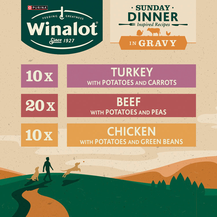 A meaty selection of complete, adult wet dog food pouches, in gravy, by Winalot. A Mega pack of 40.